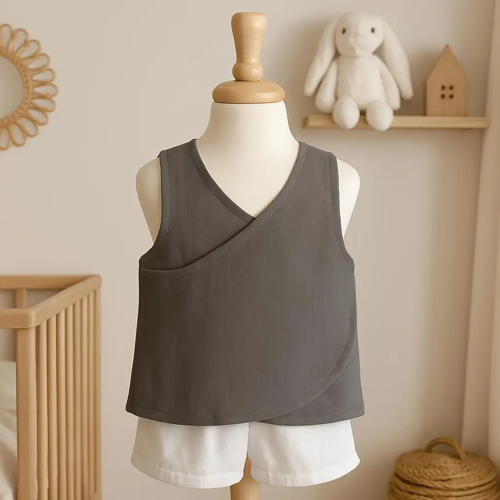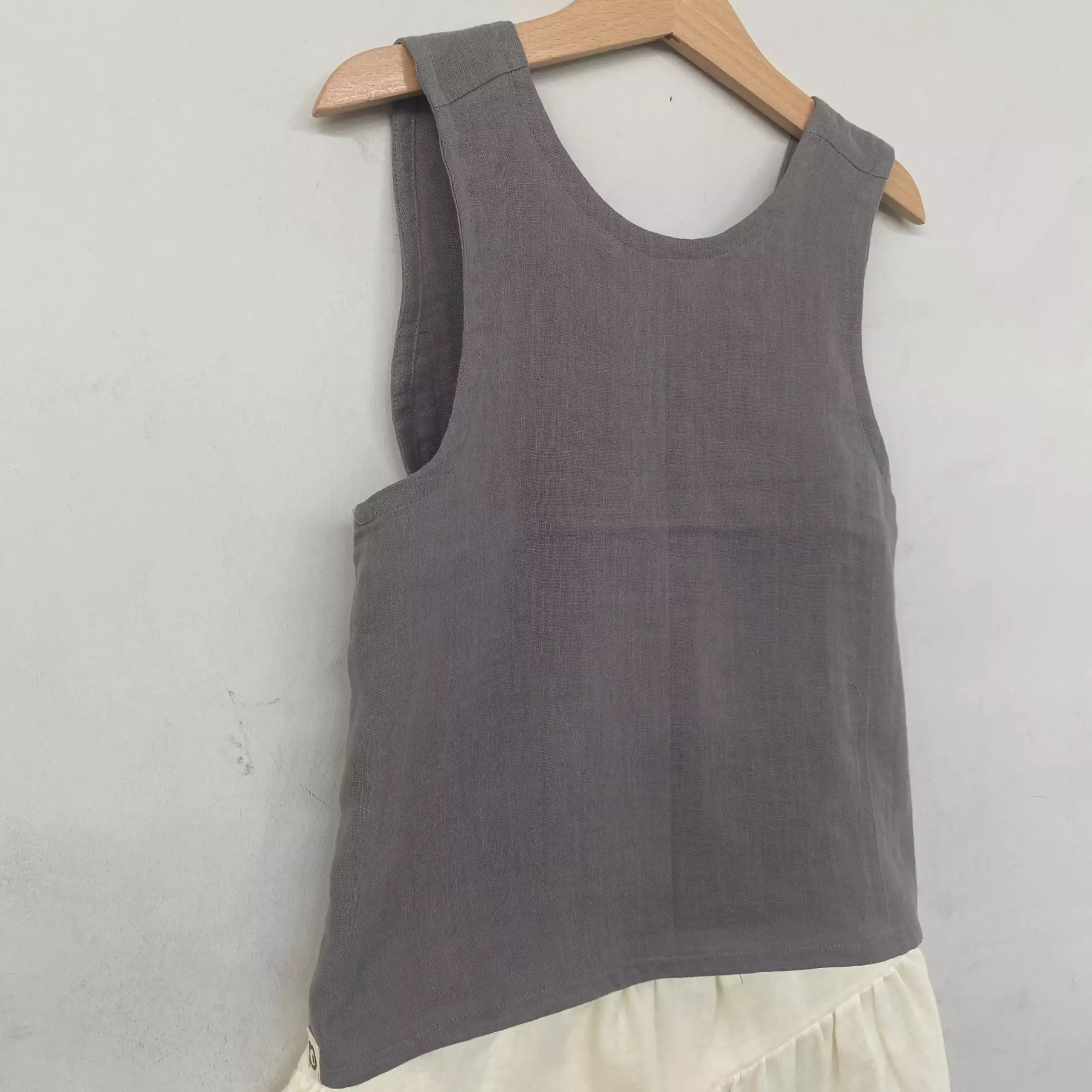 Sleeveless, minimalist, smoky gray shirt made from organic double gauze muslin for girls.