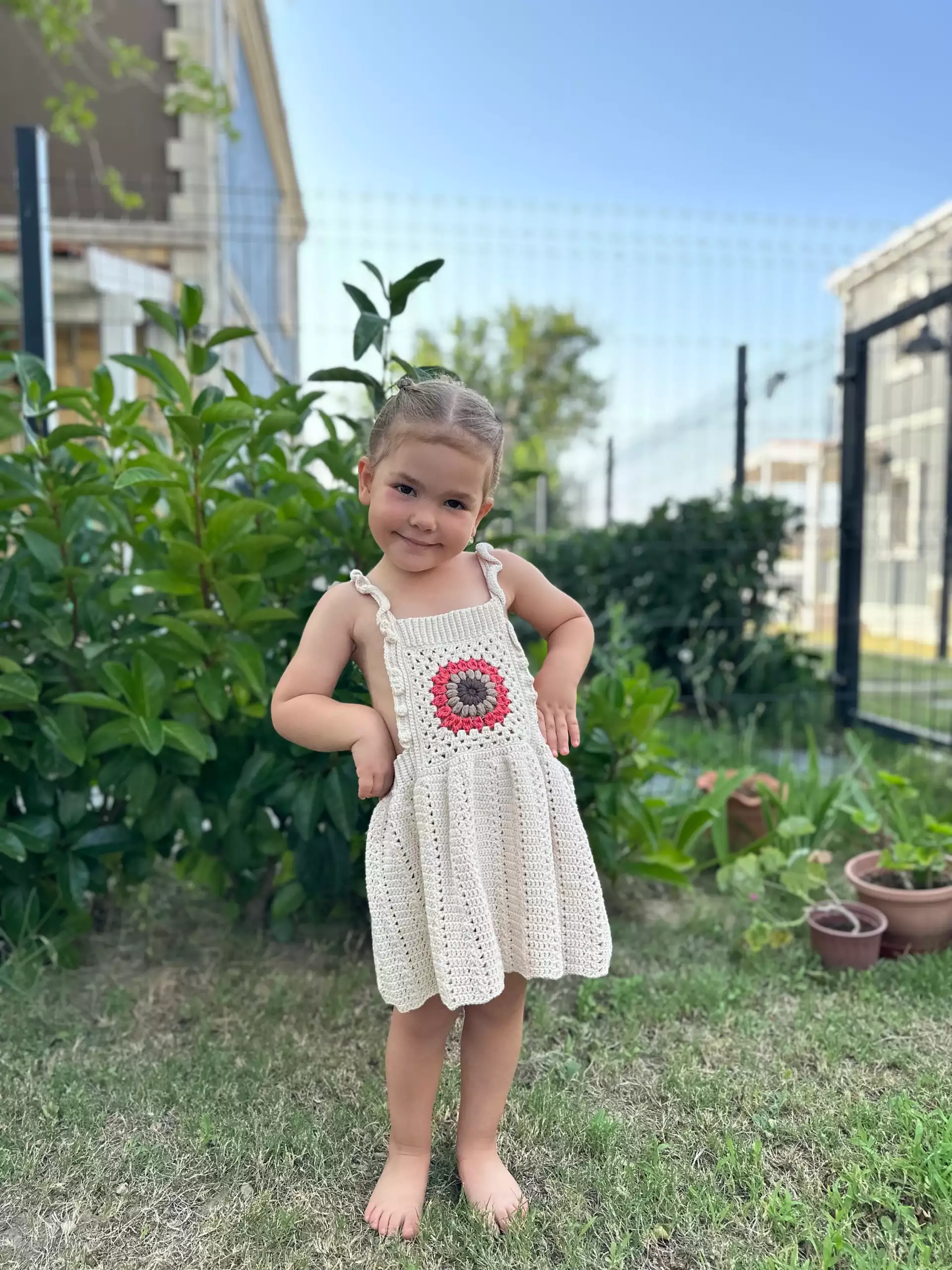 Wunderschönes und verspieltes Boho-Kleid in Beige für Mädchen mit Sonnenblumenmuster und Bolero/Shrug in Korallenfarbe aus 100 % Bio-Garn. Ein klassischer Favorit für Frühling und Sommer – Ihre kleine Tochter wird in diesem bequemen und stilvollen Kleid und Bolero-Set, das vollständig von erfahrenen Kunsthandwerkern in sanften Farbtönen für Ihre kleine Tochter handgefertigt wurde, einfach umwerfend aussehen.