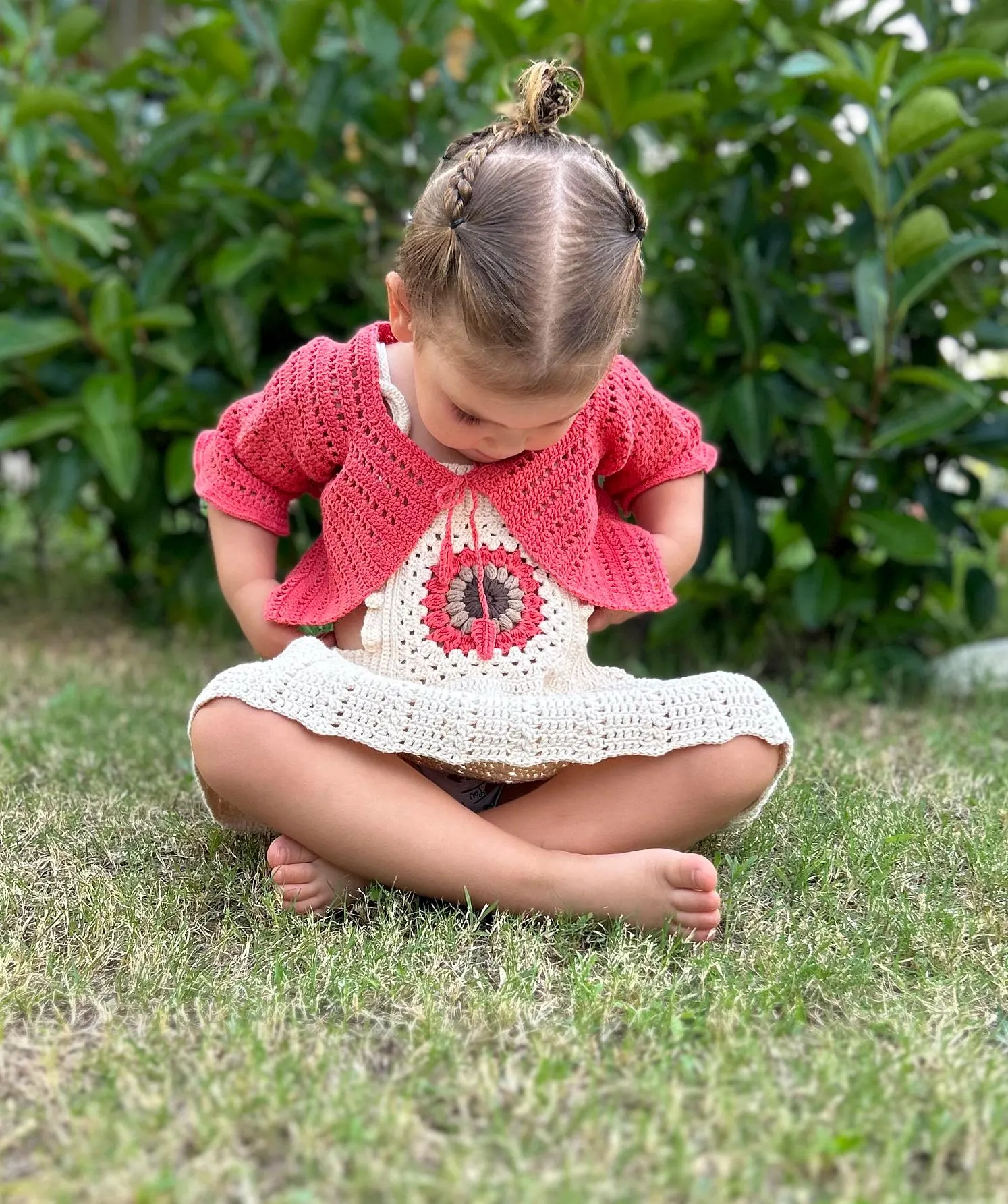 Das Kleid ist aus weicher Baumwolle gehäkelt – sanft zu empfindlicher Haut. Ein leuchtendes Sonnenblumenmotiv auf cremigem Hintergrund sorgt für einen verspielten Boho-Look. Der passende Bolero in Korallfarbe sorgt für zusätzliche Wärme und einen stilvollen Abschluss. Leicht und bequem für Frühling und Sommer.